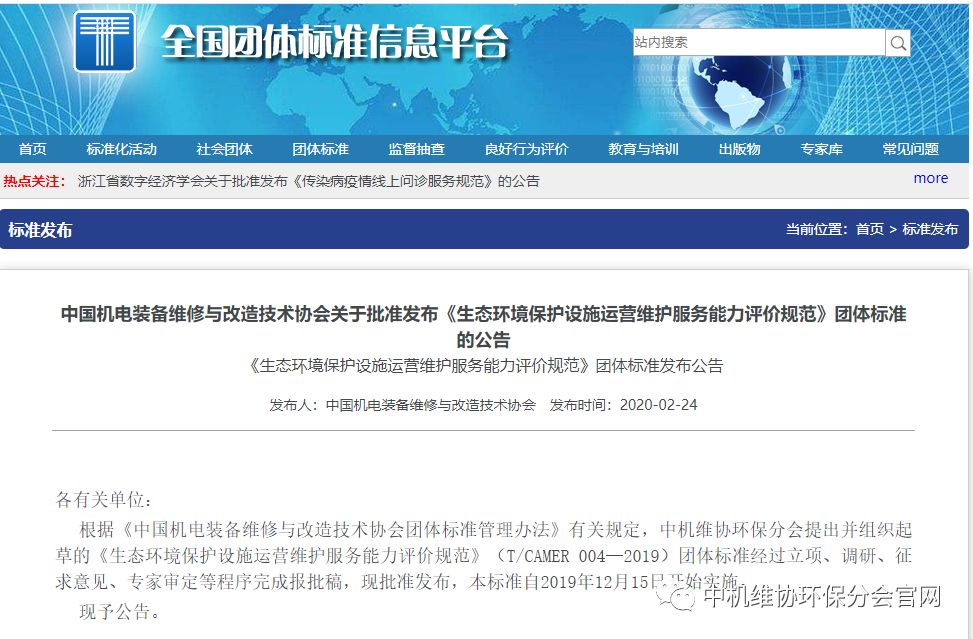 由中国机电装备维修与改造技术协会环保分会提出并组织起草的《生态环境保护设施运营维护服务能力评价规范》(T/CAMER 004—2019)团体标准经过立项、调研、征求意见、专家审定等程序完成报批稿,现批准发布,本标准自2019年12月15日开始实施。