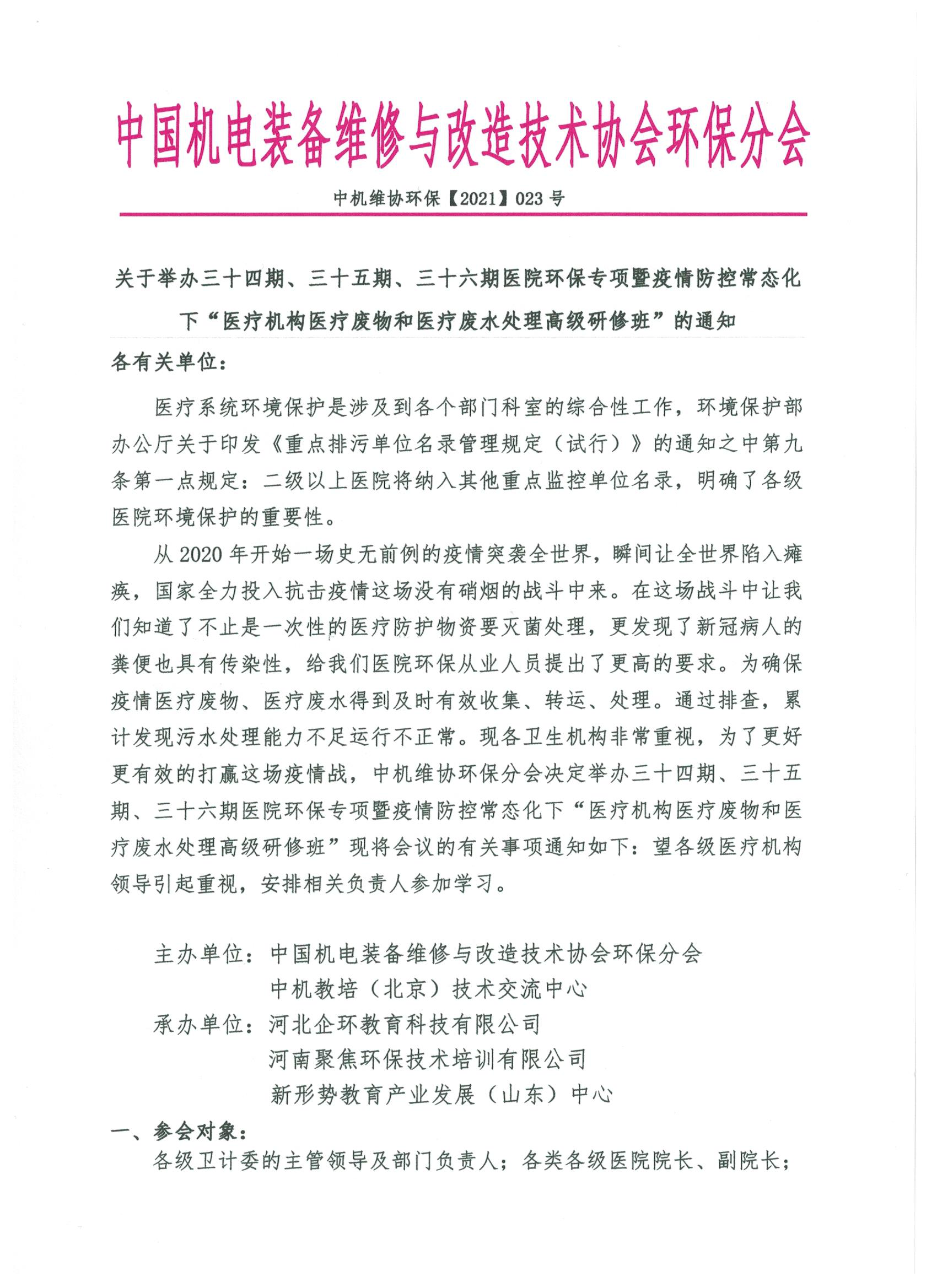 关于举办三十四期、三十五期、三十六期医院环保专项暨疫情防控常态化下“医疗机构医疗废物和医疗废水处理高级研修班”的通知