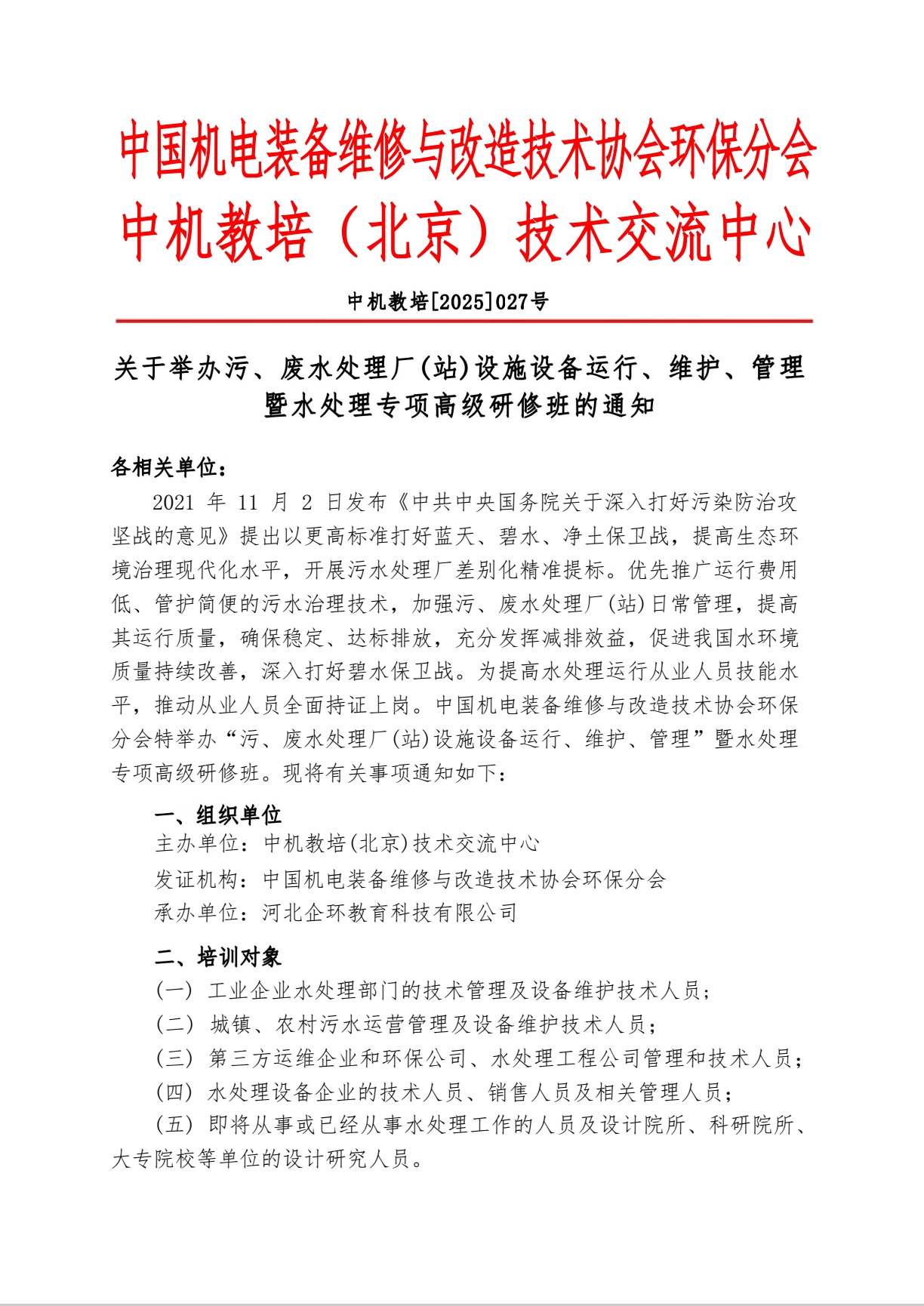 关于举办污、废水处理厂(站)设施设备运行、维护、管理暨水处理专项高级研修班的通知